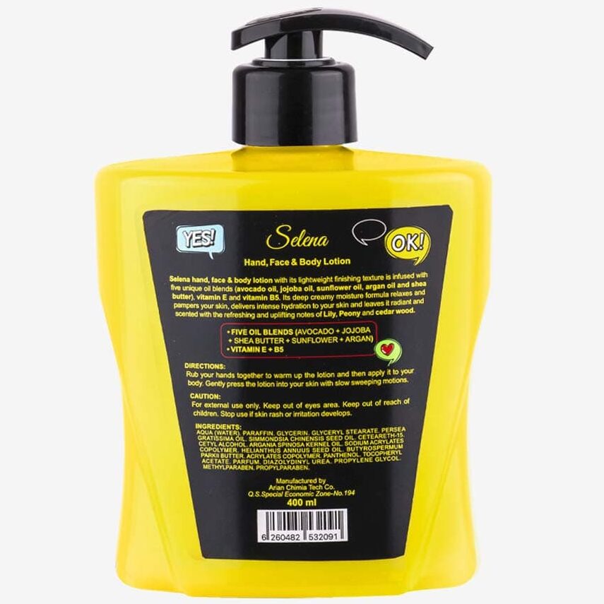 استفاده از لوسیونها برای ماساژ پوست و رهایی از استرسهای محیطی بسیار رایج است. بر خلاف لوسیونهای معمولی، لوسیون دست، صورت و بدن سلنا زرد کالیستا (Selena Hand, Face & Body Lotion) با بهرهگیری از ترکیب پنج روغن گیاهی آووکادو، جوجوبا، شی باتر، آفتابگردان و آرگان در کنار ویتامین E و B5 لطافت و زیبایی پوست را دو چندان کرده و با رطوبت رسانی به پوست، سلامت آن را تضمین میکند. رایحه این لوسیون ترکیبی از نت های چوبی – گلی، سوسن، گل صدتومانی و چوب سدر است.