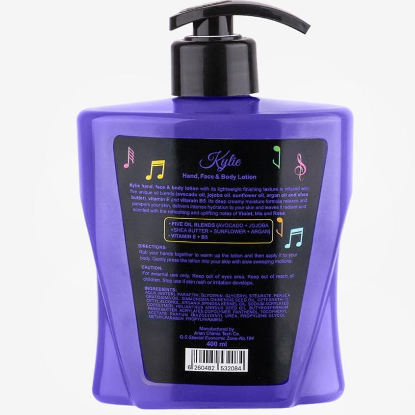استفاده از یک لوسیون خوب باعث لطافت پوست و تغذیه آن و در نتیجه زیبایی هر چه بیشتر شما میشود. لوسیون دست، صورت و بدن کایلی بنفش کالیستا (Kylie Hand, Face & Body Lotion) با بهرهگیری از ویژگی های پنج روغن گیاهی روغن آووکادو، روغن جوجوبا، شی باتر، روغن آفتابگردان و روغن آرگان در کنار ویتامین E و B5 زیبایی شما را ماندگار کرده و پوست شما را مرطوب و لطیف میکند. رایحه این لوسیون، ترکیبی از نتهای گلی بنفشه، زنبق و رز است.